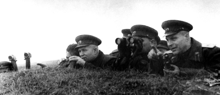 Командир 22 гв. ск 6 гв. А генерал-майор Н.Б. Ибянский {первый справа) объясняет обстановку командующему 6 гв. армией генерал-лейтенанту И.М. Чистякову (с биноклем в центре) и члену Военного совета Воронежского фронта генерал-лейтенанту Н С. Хрущеву (третий справа) Обоянское направление.
