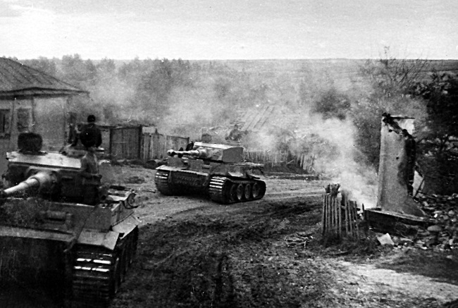 Танки «Тигр» одной из немецких дивизий движутся через захваченное село. Обянское направление. Воронежский фронт Мюль 1943 г.