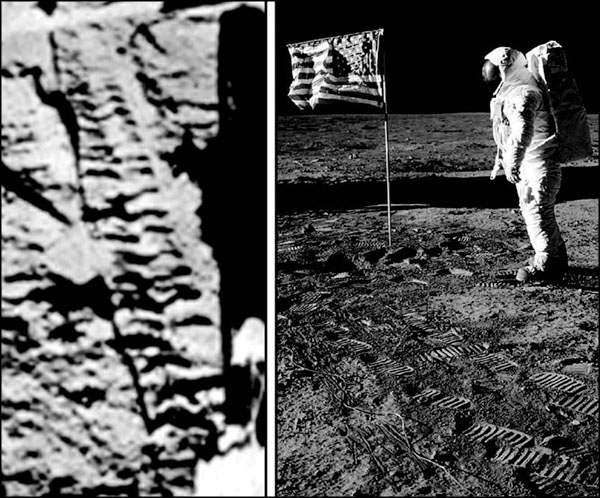 Рис. 11. Фото следов лунохода и «астронавтов». Сравните следы, оставляемые Э. Олдрином и «Луной-16». Следы Олдрина четкие, они «блестят», а след колес «Луны-16» осыпавшийся, нечеткий