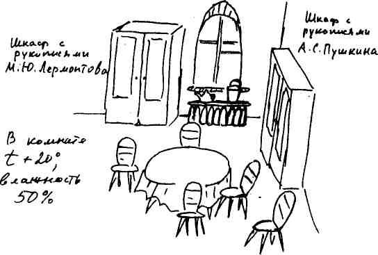 Шкафы с рукописями Пушкина и Лермонтова разделяет только массивное окно во двор. Стекла шкафов закрыты зеленой тканью. Между шкафами, под окном, деревянная, в размер окна, скамейка. На ней — старенький синий эмалированный чайник без крышки с водой и старенькое железное ведро, тоже с водой. Влажность в хранилище должна быть 50 %, а температура +20 °.