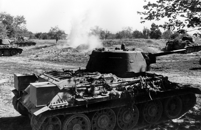 Вскоре первый снаряд отправился к цели, и после попадания «Т-34» вспыхнул. Он был от нас всего метрах в 50–70. В тот же миг соседний с моим танк получил попадание и загорелся. Я видел, как унтершарфюрер Парке покинул машину, но больше мы его так никогда и не увидели. Его сосед справа также был подбит и вскоре тоже был объят пламенем.