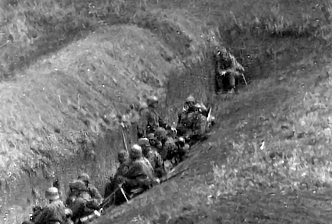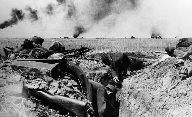 Я со взводом бежал за танками. Достигли траншеи, вскочили в нее. У входа в блиндаж лежал на ПТР убитый старший лейтенант в сгоревшем обмундировании (сохранился только воротник с тремя кубиками на петлицах). Заглянул в блиндаж, увидел диск к автомату ППШ, взял его. Он оказался полностью снаряженным патронами.