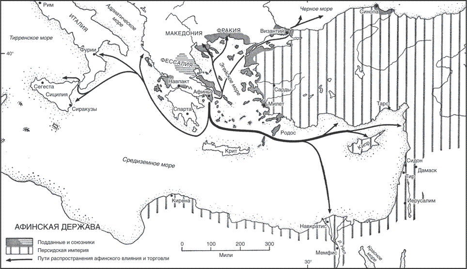 Однако в Афинах все было иначе. В Темные века Афины стали единым городом-государством, превосходящим по размерам все остальные города Греции. На протяжении VI века до н. э. их производства и торговля быстро развивались. Хотя внутренние противоречия и привели к появлению целой череды реформаторов и тиранов, результатом стало создание к 500 году до н. э. демократического общества, в котором власть находилась в руках граждан. Теперь афинские государственные деятели получили ту ведущую роль, которую была готова уступить Спарта. Результатами этого оказались создание обширной Афинской державы, еще более развитая демократия в материковой Греции, огромный культурный прорыв и, наконец, великая Пелопоннесская война (431–404 годы до н. э.) между гордыми Афинами и испуганной Спартой, итогом которой стало крушение афинской власти. Однако до этого момента V век до н. э. несомненно являлся «эпохой Афин». Временами забываешь, что Афины были лишь одним из примерно двухсот греческих городов-государств.