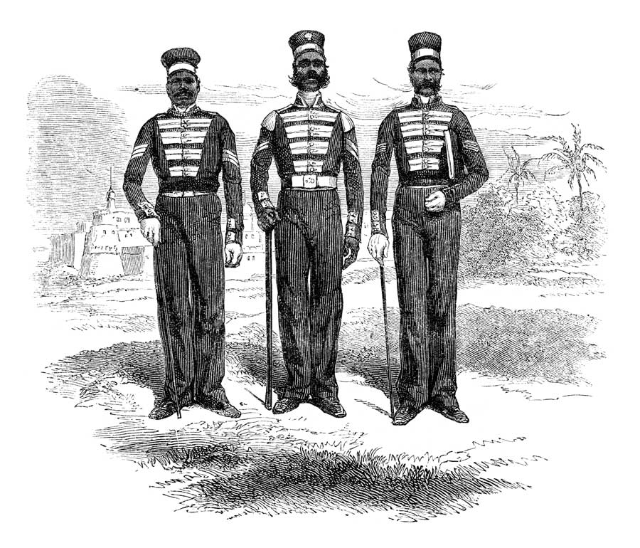 Важную роль в захвате Индии играли войска Ост-Индской компании. Сначала англичане воевали традиционно — экспедиционным колониальным корпусом. Но вскоре они стали нанимать на службу и обучать местных жителей, так, уже в 1757 году, когда англичане громили Сираджа-уд-Даула, в английском отряде было 2000 местных наемников. Но по-настоящему формирование войска Компании началось в 1772 году генерал-губернатором Уорреном Хейстингсом. Он как раз сделал основой армии индийских наемников, сипаев. Слово «сипай» происходит от персидского «сипахи» — солдат. Структура войск Компании была такова: старшие офицерские должности обычно занимали англичане, младший состав и рядовой — туземцы. При этом в Индии под контролем Компании оставались и собственно британские подразделения. Так, на 1796 год войска Компании насчитывали 70 тысяч, из них как таковых британцев 13 тысяч, а еще 57 тысяч сипаев. Для туземных подразделений была сформирована отдельная иерархия унтер-офицерских чинов. Сипай соответствовал рядовому британской армии, выше шли ланс-наик, наик и хавильдар в пехоте или ланс-дафадар-стажер, ланс-дафадар и дафадар в кавалерии — то же самое, что сержант, капрал и ефрейтор. Кстати, эти же названия до сих пор используются в индийских и пакистанских наземных войсках.