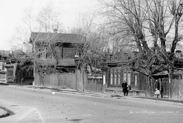 Дом, в котором проживала семья Винничевских – №21 по улице Первомайской. По соседству с тем самым домом №19, в котором жила Герда Грибанова, первая жертва маньяка. Под окнами Винничевских шагает мужчина в чёрном пальто и шляпе. Фотография сделана в 1950-х гг. Дом, в котором проживали Грибановы, расположен ближе к левом срезу фотографии. Этот же самый участок Первомайской улице запечатлён под другим ракурсом на фотографии во 2-й главе.