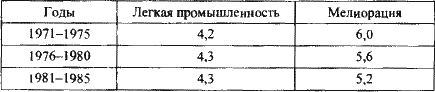 Многие проекты, в которые вкладывались значительные ресурсы, оказывались либо малоэффективными, либо бессмысленными. Характерный пример – мелиоративное строительство. По объему капитальных вложений эта отрасль опережала легкую промышленность (см. табл. 4.1, 4.2)