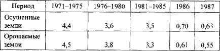 В 1986–1990 гг. для нужд мелиоративного строительства предполагалось произвести 35 тыс. экскаваторов, 32 тыс. бульдозеров, 10 тыс. тракторов типа К-700, 4,4 тыс. тракторов тяглового класса 10 тонн и выше, 22 тыс. скреперов, 6,3 тыс. автомобильных кранов и т. д. Редакциям центральных и местных газет, Государственному комитету по телевидению и радиовещанию, Государственному комитету по кинематографии было поручено обеспечить освещение в печати, средствами кино, радио и телевидения достижений в мелиоративном строительстве и эффективности мелиорации в реализации Продовольственной программы в СССР.[233] Результаты этой циклопической деятельности были скромными. С течением времени объемы выбывающих орошаемых и осушенных площадей почти сравнялись с объемами вводимых (см. табл. 4.3).[234]