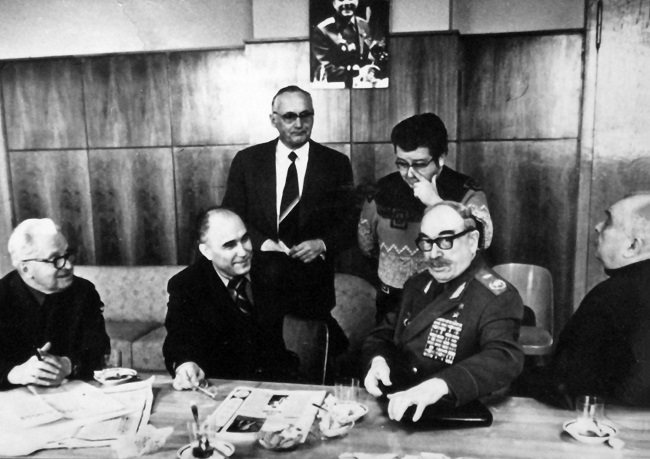 П.А. Ротмистров в редакции газеты «Известия». В центре – главный редактор Л.Н. Толкунов, за столом первый слева – заведующий военным отделом В.П. Гольцов. 1960-е г. (Архив Н.Ю. Ротмистрова)