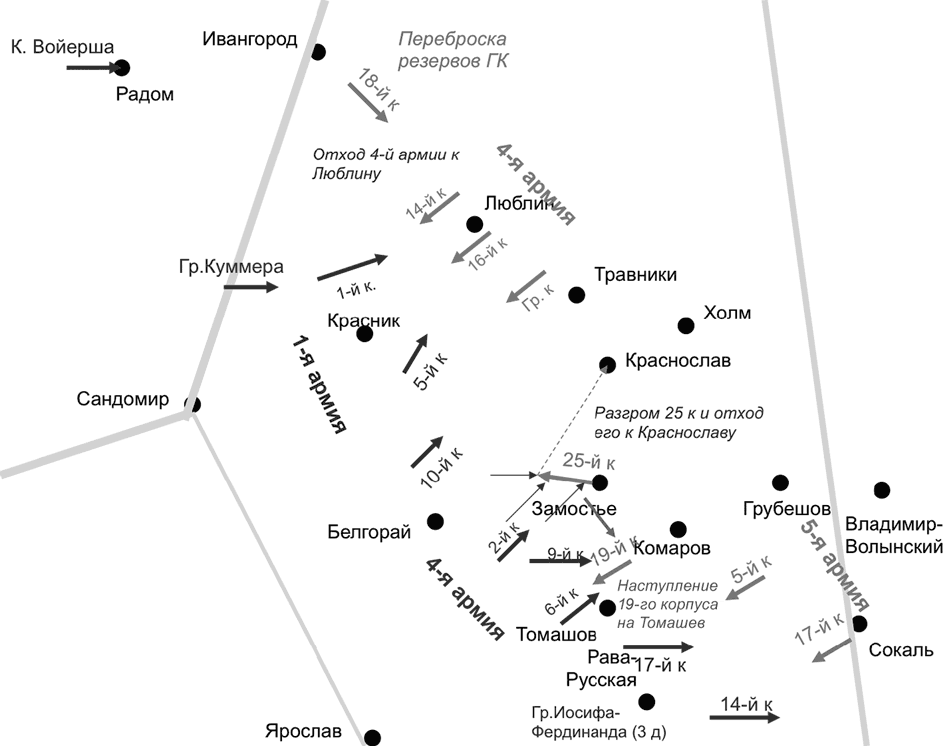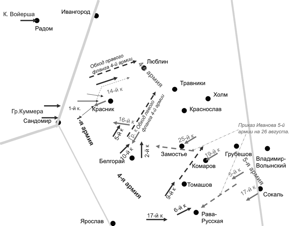 24 августа Иванов, обеспокоенный ситуацией на своем северном фланге, меняет задачи 5-й армии. Теперь она должна была действовать во фланг и тыл 1-й австрийской армии, для чего требовалось развернуть армию к северо-западу и сблизиться с 4-й армией. При этом исчезала всякая надежда как-то связать русские операции на правом и левом крыльях фронта, возрастал промежуток между 5-й и 3-й армиями, и сверх того 5-я армия сама попадала под угрозу флангового удара, причем не справа, а слева. Иными словами, решение было самым неудачным из всех возможных. Понимая это, командующий фронтом потребовал от 5-й армии одновременного наступления еще и в южном направлении. Армия разбивалась на два отряда, выполняющие две совершенно различные задачи.