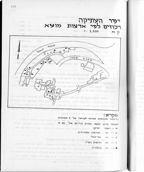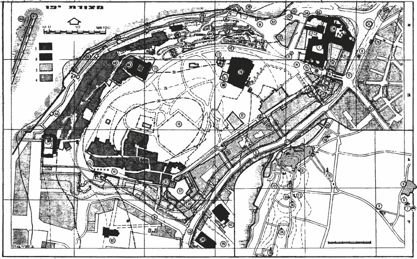 Ил. 67. «Старая Яффа, плотность населения согласно стране происхождения»: карта Старого города Яффы (она же «Большая зона») из материалов министерства жилищного строительства, с подробным указанием происхождения жильцов. Среди мест происхождения названы: Марокко, Восточная Европа, Триполи (Ливия), страны Азии и Болгария. Старая Яффа («Большая зона»). Экономико-социальный обзор. Министерство жилищного строительства, 1962.