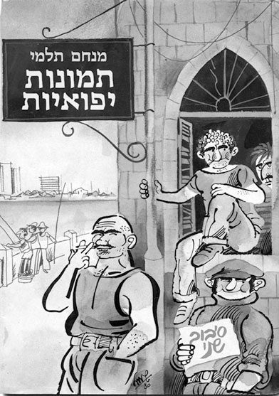 Обложка второго тома из серии книг Менахема Тальми «Яффские рассказы» – собрание детективных историй (в стиле Дэймона Раньона), действие которых происходит в Яффе. Иллюстрация: Шмуэль Кац, Sifriat Maariv, 1982.
