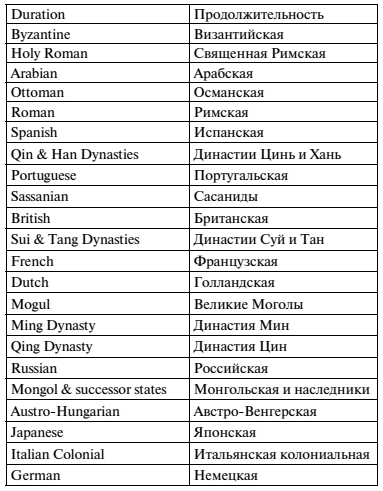 Здесь представлены, начиная с древнеримской, основные империи, определяемые как институционализированные системы власти над многоязыковым и многонациональным сообществом, осуществляемой исполнителями, способными понимать и выполнять письменные распоряжения из центра. Не включены недолговечное владычество над завоеванными территориями, удерживаемое лишь при жизни завоевателя. Отсчет жизни империи ведется от первого установления власти над чужеземным населением, гибелью считается утрата большей части иноземных доминионов. Диаграмма подготовлена Томом Уильямсом и Бреттом Эдкинсом.