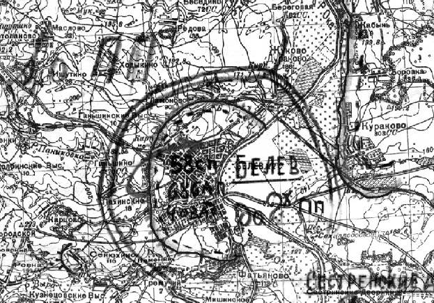(оба пункта 15–18 км западнее и юго-западнее г. БЕЛЕВ) и продолжала наступление в южном и юго-восточном направлениях.