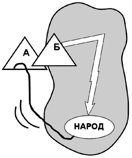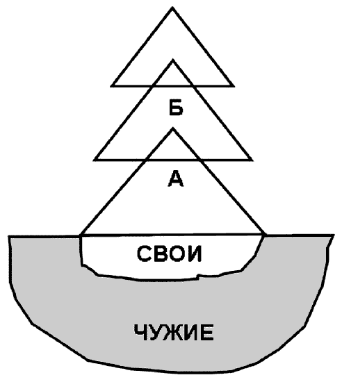 В любом случае обязательное условие — вершина треугольника «Б» не принадлежит треугольнику «А». По типу жизни, социальным ролям лидеры второй пирамиды не хотят и не могут принадлежать к первой — это социальная «аксиома». Повторяю, лидеры структуры «Б» не принадлежат «А», а значит, лидеры структуры «А» не могут лидировать в «Б». Я делаю это утверждение, исходя не из того, что «А»-шники — хорошие люди, я в принципе не хочу говорить здесь о людях. В такой игре «все люди — числа», элементы сложного механизма власти, и не более того.