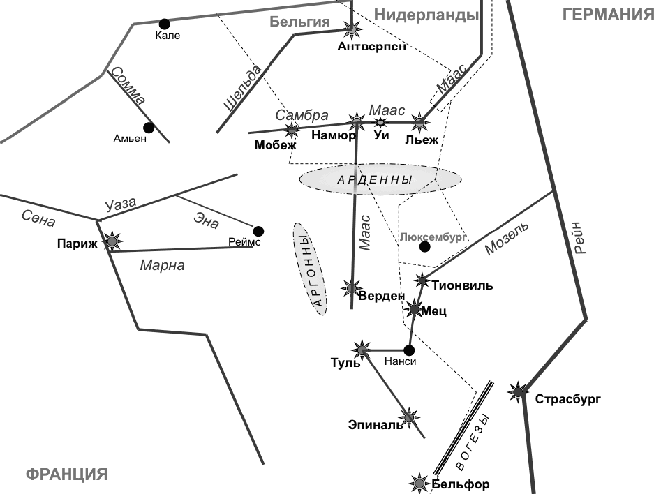 Реки «схвачены» крепостями. На Маасе – это Льеж и Намюр, форт Гюи между ними, а также Верден. На Шельде – Антверпен. На Самбре – Мобеж и опять-таки Намюр. На Мозеле – германская крепость-лагерь Мец, французские крепости Туль и Эпиналь, укрепление Нанси. Несколько восточнее, на реке Иль, расположен немецкий Страсбург: он контролирует западный берег Рейна.