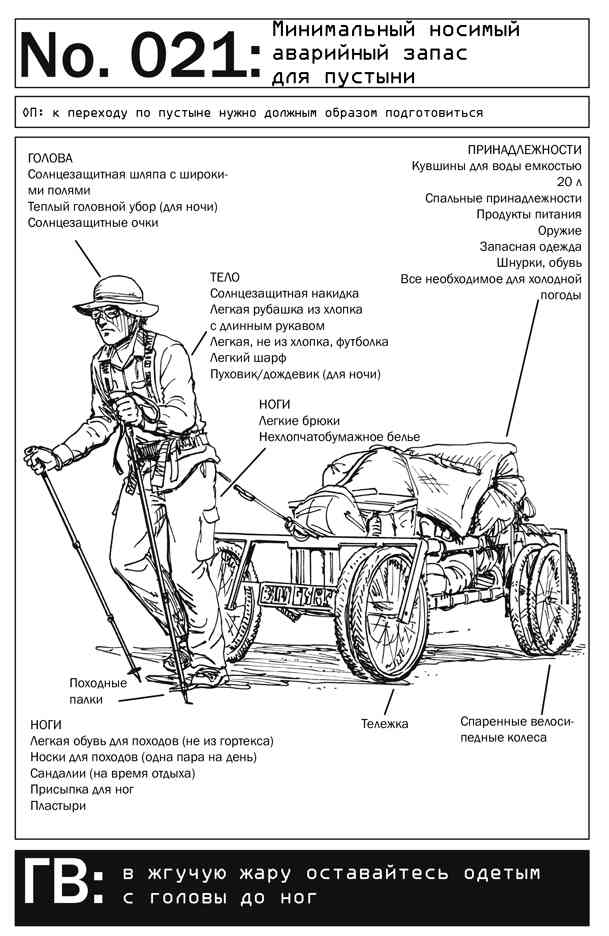Помните: подготовка к резким перепадам температуры в пустыне означает, что вы не будете путешествовать налегке. Помимо прочего, вам нужно запастись одеждой на случай холодной погоды: ее вы будете надевать на себя при совершении переходов в ночное время. Поговорка «Легкий мешок нести, конечно, проще, но ночью ты будешь мерзнуть» верна не только для арктических условий, но и для пустыни.