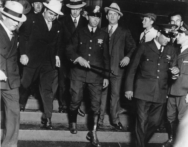 Аль Капоне (второй слева) под стражей покидает зал суда в Чикаго. Он был осужден по обвинению в уклонении от уплаты налогов. 12 октября 1931 года.