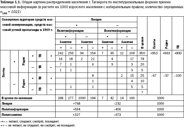 Еще в 1973 г. была получена общая картина распределения деятельности населения по использованию средств массовой информации и пропаганды на институциональном уровне. Сама идея была весьма проста. Так как обмен свойствами и способностями индивидуумов носит предметный характер и протекает в различных институциональных формах социальной среды, то за отдельными частными формами и их качественным разнообразием стоят суммарные социальные потребности, в данном случае – в информации, средства удовлетворения которых могут быть представлены на полюсах «общество» и «знание об обществе» в интегрированном виде. Сфера деятельности выступает при этом как совокупность актов поведения личности, рассмотренных на уровне институциональной структуры. Так, можно допустить, что сфера приема информации населением из системы информационно-пропагандистских средств представлена шестью «элементарными» формами контакта с институциональными поставщиками этой информации: чтение газет, просмотр телепередач, прослушивание радио, лекций, политинформаций, посещение политзанятий. Уже здесь каждая из «элементарных» форм социальных институтов выступает в известной мере как нечто синтезированное, безразличное к свойствам и функциям предмета, на который направлена деятельность, к мотивам присвоения предмета или к конкретному каналу – поставщику информации (скажем, к теме информации или ее функциям – «дать сведения», «развлечь», мотивам – «снять напряжение работы», «сориентироваться в социальной обстановке», «убить время», и т. п.).