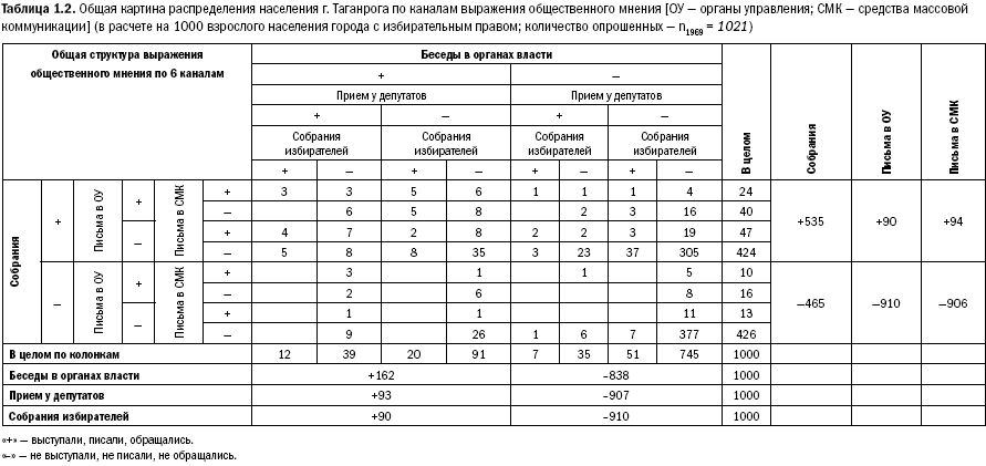 Замечу: сам характер заполнения таблицы свидетельствует о качественной характеристике общества. Клетки таблицы могли бы быть заполнены иначе. И это было бы другое общество. Выявленная же структура достаточно ярко показывает недостаточность даже предшествующих нынешнему периоду институтов обратной связи. Воздержимся от сравнений. Мы пока что конструируем инструменты анализа системы в целом. То, как они заработают, можно показать на примерах пилотажных маленьких исследований по 1000 – 2000 респондентов. Но перед этим надо показать результаты анализа Всесоюзных десятитысячных исследований, которые дадут исчерпывающую картину развертки процесса социальных изменений относительно некоторых базовых точек отсчета.