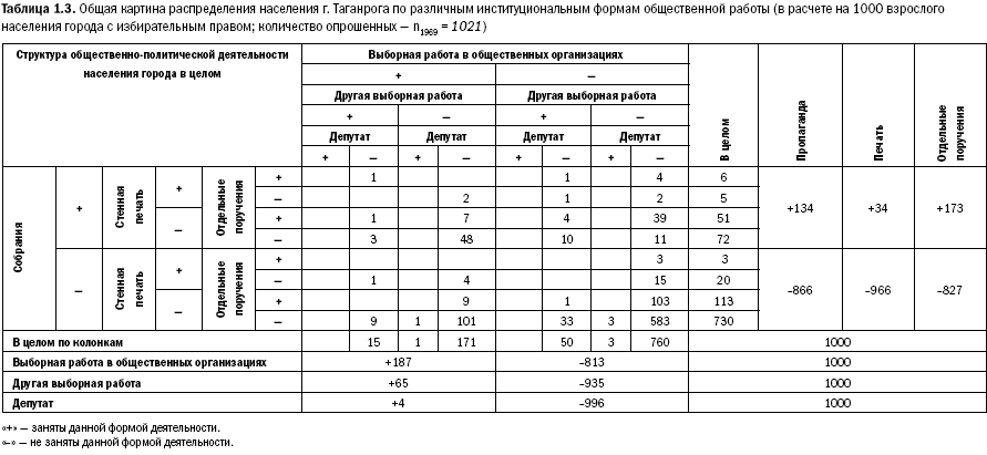 Возьмем последнюю из подсистем массовых форм информационного обмена, протекавшего в нашем обществе 40 лет назад, – общественно-политическую деятельность, охватывавшую почти половину населения промышленных центров страны. Она была стандартна, функционально обеспечивала реализацию процессов материального производства и поддержки определенного «идеологического мускула» в обществе. Такие структуры во все времена тождественно пронизывают все поры социального организма. Заранее оговорю тот факт, что в связи с тем, что это организационная структура, ее наполненность в Таганроге 1969 и 1979 гг. и в масштабах страны в 1977 и 1981 – 87 гг. по сопоставимым группам населения практически совпадает. В 1991 г. она трансформируется в те формы, которые требуют теперь в нашем обществе специальных методов изучения[18]. Не говоря о том, что уже вопрос о трансформации определенных политических групп в слои коммерческие, сразу «подвешивает» проблему достоверности данных из-за «конфиденциальности» сведений. Если эти данные еще согласятся дать.