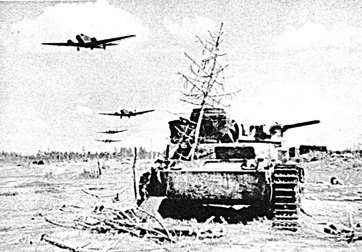 Ю-52 продолжают снабжать войска под Демянском. На переднем плане подбитый немецкий танк