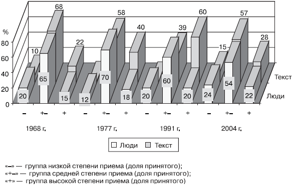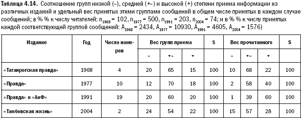 В табл. 1.11 и 1.12 мы показывали составы групп различной активности в аудиториях исследованных газет. Напомним, группы различной степени активности в информационном приеме «низкой», «средней», «высокой» были рассчитаны на основе стандартного отклонения от среднего числа принятых в день сообщений. Оно везде и всегда одинаково – около 23 сообщений. Однако в 1968 г. читателю предлагалось до 42 сообщений на четырех полосах, в 1977 г. – уже от 60 до 80 сообщений на шести полосах, а в 1991 г. «АиФ» и «Правда», аудитория которых принята в таблице за основу, предлагали уже более 100 сообщений в день. С 1991 по 1994 гг. рынок центральных газет рухнул (в Касимове 1994 г. и в Питере 1999 г. лишь по 52 % жителей читали газеты). Однако за счет региональной прессы аудитория газет расширилась снова до трех четвертей взрослого населения. «Тамбовская жизнь» 2004 г. близка по числу публикуемых содержательных сообщений (без скрытой и явной рекламы) к объему информационного потока «Таганрогской правды» 1968 г.