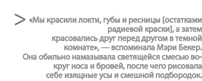 «Мы красили локти, губы и ресницы [остатками радиевой краски], а затем красовались друг перед другом в темной комнате», – вспоминала Мэри. Девушки всегда получали новые баночки с материалом после обеда, так что с оставшейся с утра краской могли делать все, что им заблагорассудится. Мэри обильно намазывала светящейся смесью вокруг носа и бровей, после чего рисовала себе изящные усы и смешной подбородок. Девушки строили друг другу рожицы – им это казалось до одури смешным. Шарлотта Невинс вспоминала, как они «выключали свет, смотрелись в зеркало и много смеялись. [Мы] сияли в темноте!»