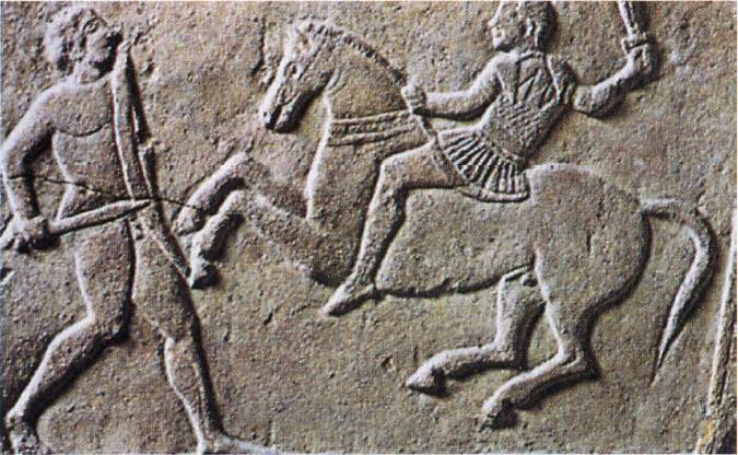 Сражение между воином-этруском и обнаженным галлом (с могильной плиты V в. до н. э.). В наготе галла выражается «священная боевая ярость» (по — латыни furor, по-немецки Wut); речь идет об энергии, которую воины научились активировать во время продолжительных тренировок, что подготавливало их к достойной встрече с врагом. Так, легендарный герой Кухулии после сражения должен был три раза окунуться в бадью с ледяной водой, чтобы охладиться, перед тем как одеться.