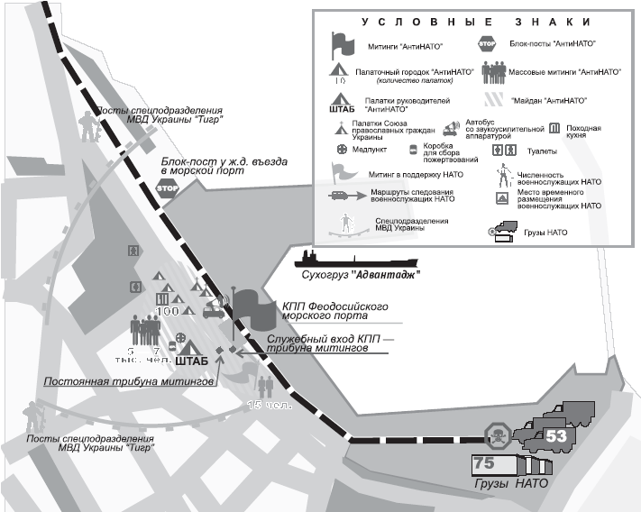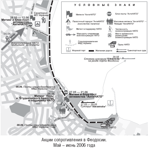 Блокирование объектов, примененное в ходе антинатовской акции в Крыму, было одним из основных методов давления на власть, использованных в свое время в ходе «оранжевой революции». Идея этого метода проста: если площадь или дорога заполнены людской массой, палаточным городком и т. п. и протестующие не соглашаются их покинуть, у власти есть лишь один способ вернуть себе контроль над этим местом – применить силу. Если возможности сделать это нет, контроль над пространством оказывается в руках протестующих, они лишают заблокированный объект (в ходе «бархатной революции» – орган власти) возможности выполнять свои функции либо пытаются вынудить работников объекта действовать в нужном для себя направлении (так в свое время поступили «оранжевые» с избирательной комиссией во время выборов). Характерно, что снять блокирование, после того как оно началось, без применения грубой силы крайне сложно. Бороться с ним можно, только не допуская его, – заранее заполнив пространство сторонниками другой стороны.