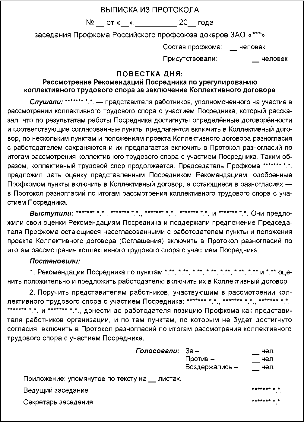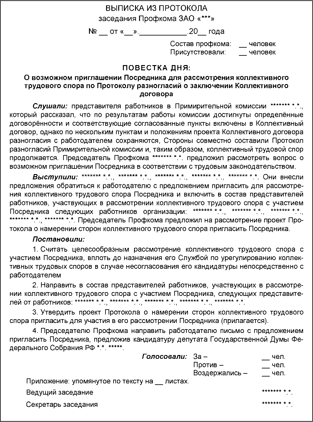 Выписка из Протокола заседания Профкома, принявшего решение обратиться к работодателю с предложением привлечь для рассмотрения коллективного трудового спора Посредника