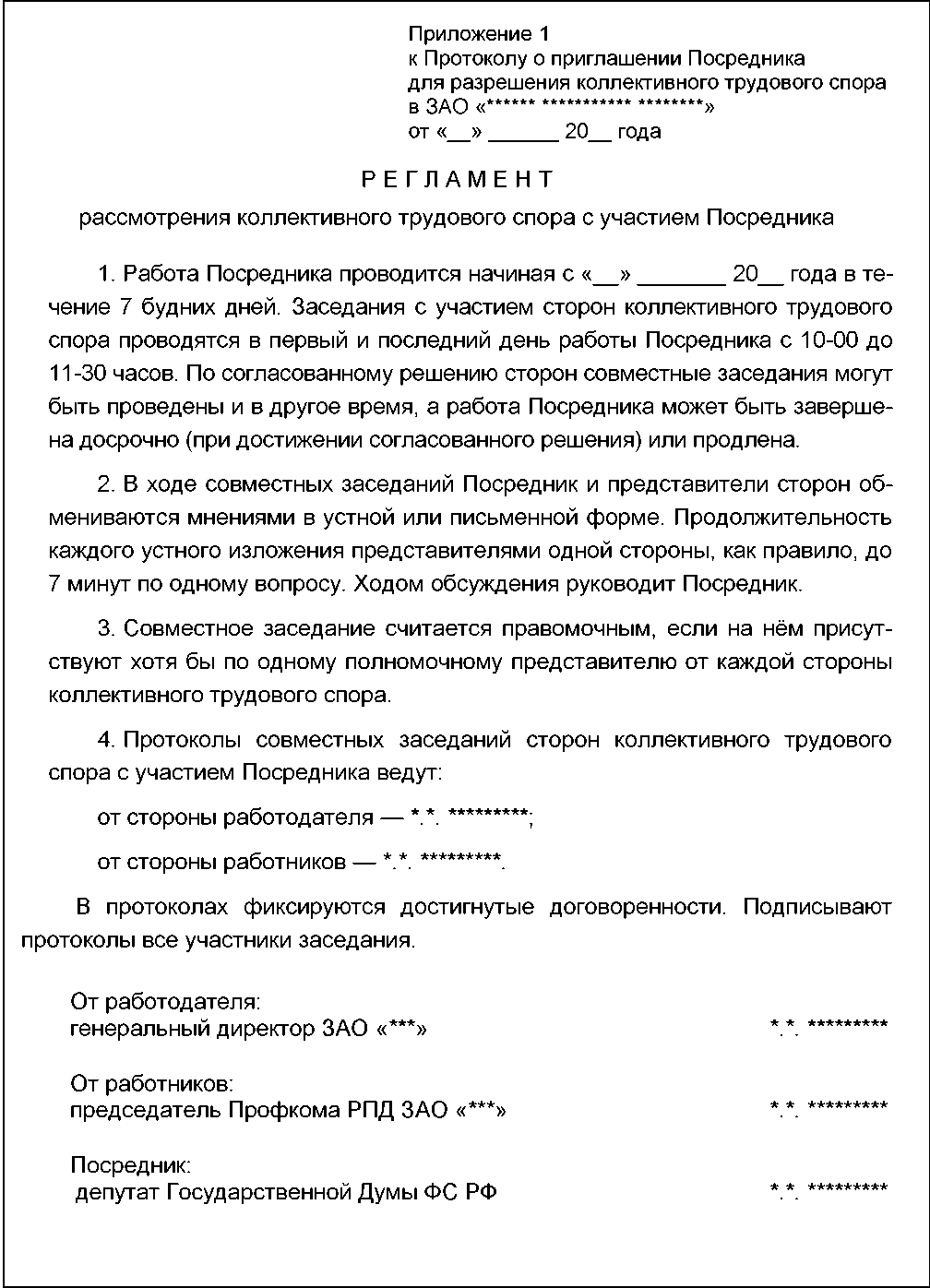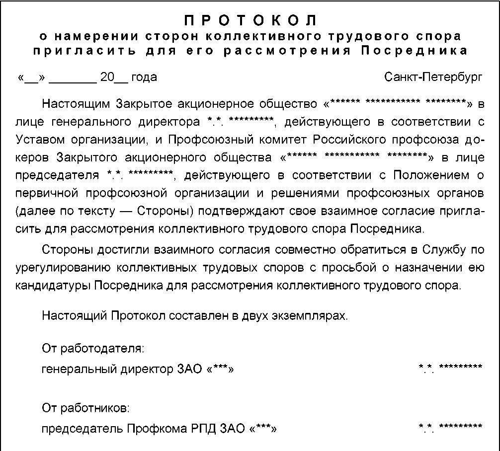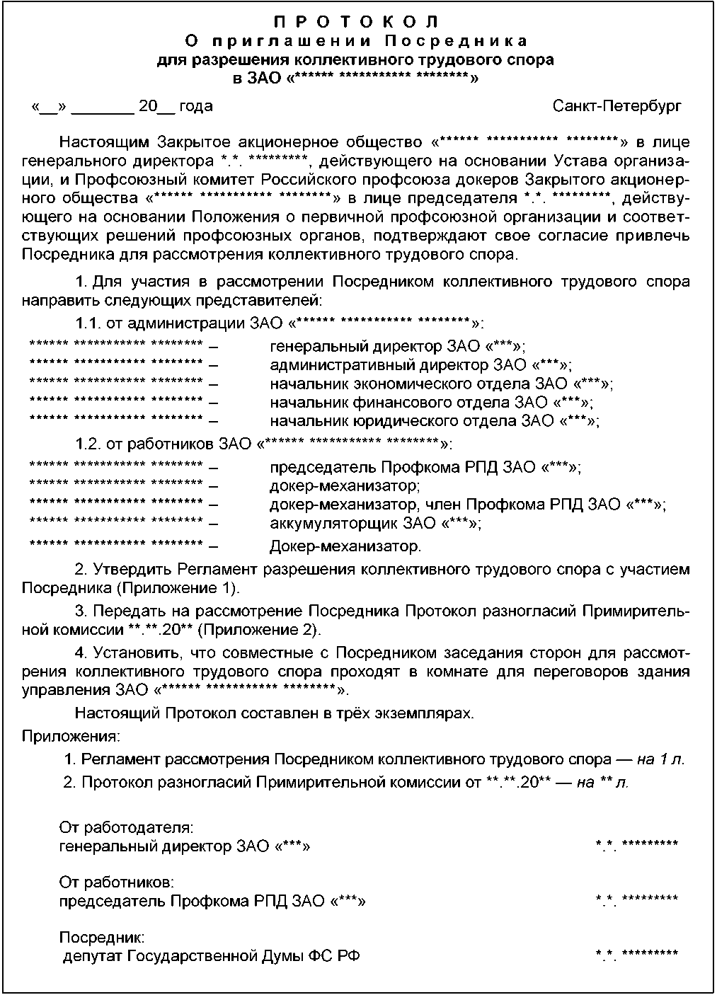 Протокол о привлечении сторонами коллективного трудового спора Посредника для рассмотрения данного спора