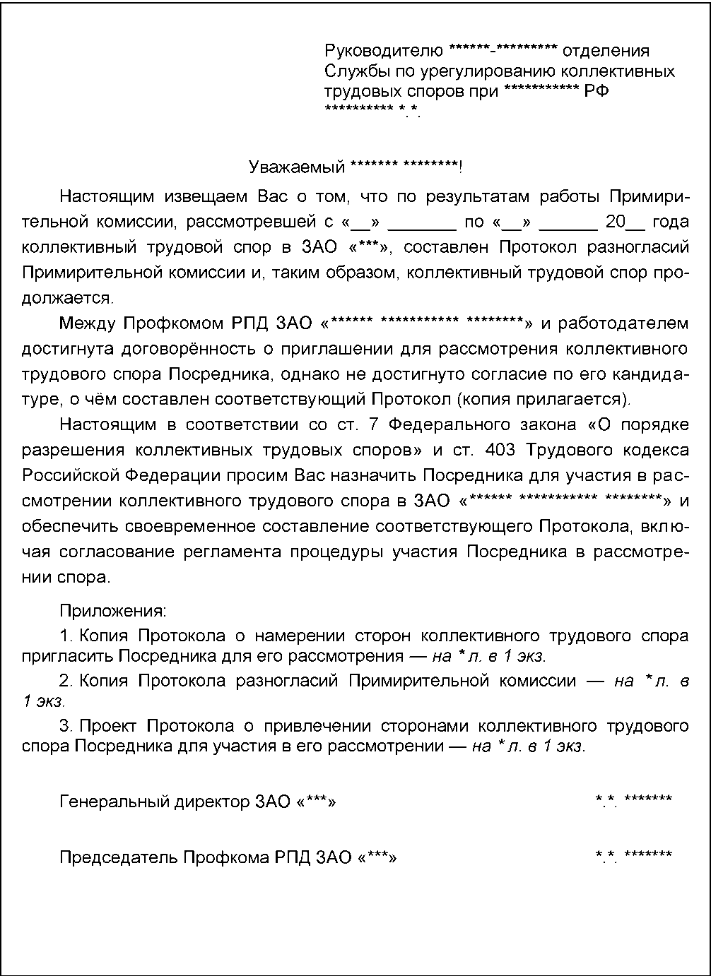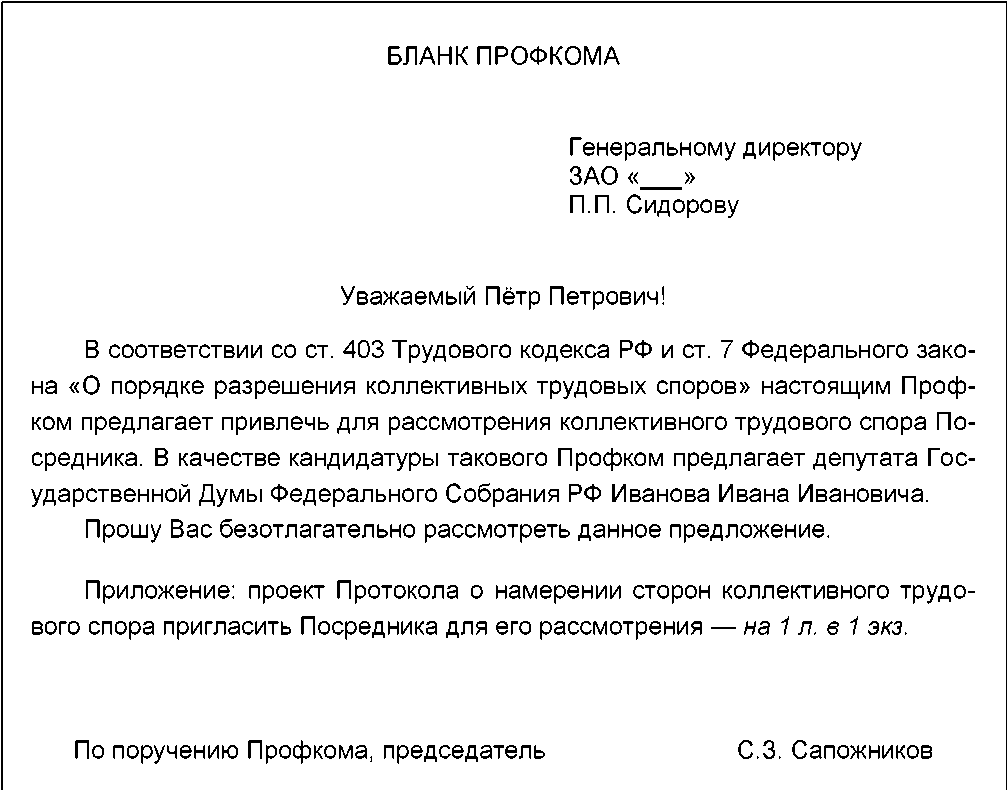 Обращение Профкома, к работодателю с предложением пригласить для рассмотрения коллективного трудового спора Посредника