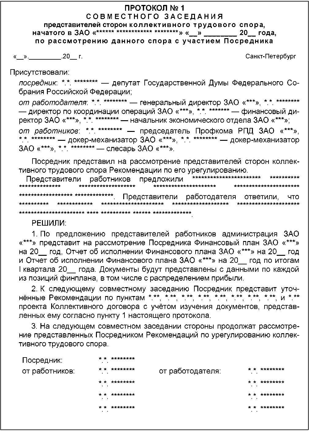 Протокол совместного заседания сторон коллективного трудового спора с участием Посредника
