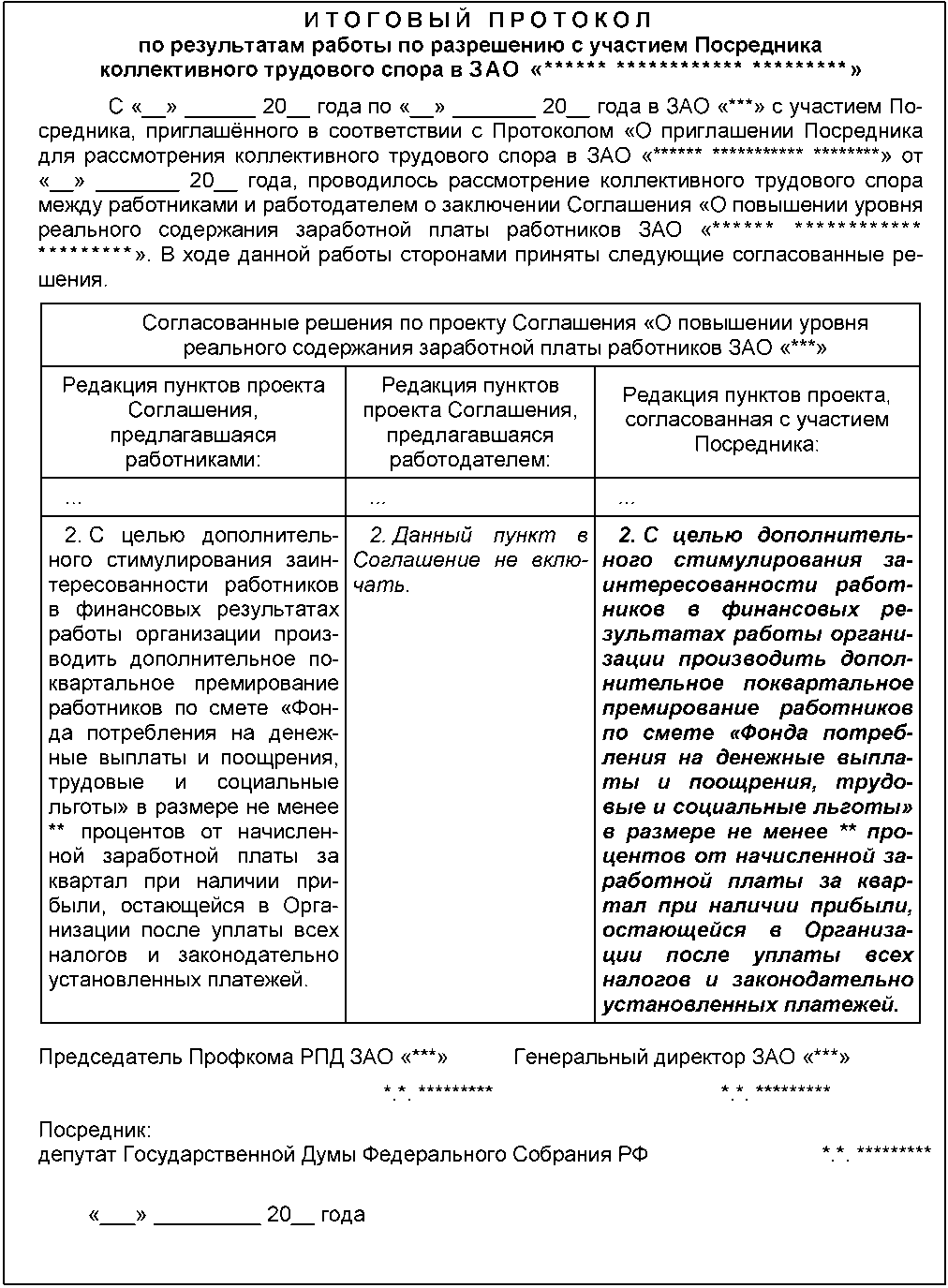 Итоговый протокол по результатам рассмотрения коллективного трудового спора с участием Посредника