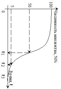 На рис. 2 показан характер убыли с течением времени элементов из первоначального состава некоторого множества. Предполагается, что в начальный момент времени множество определено по персональному составу элементов и его численность составляет 100 % . Далее под воздействием внешних и внутренних обстоятельств элементы множества исчерпывают свой ресурс и гибнут. Если в популяции живых организмов выявить её персональный состав, а потом следить, как выявленные в начале особи исчезают из популяции, то получится примерно такой же по характеру график, как показан на рис. 2, но с количественно определенным масштабом по осям времени и численности. Процесс, показанный на рис. 2, не означает, что с его завершением популяция исчезнет. Хотя такое и возможно в принципе, но в подавляющем большинстве случаев обновляется персональный состав членов популяции (элементов множества). То есть с исчезновением одного множества, выявленного по персональному составу в начальный момент времени, можно выявить новое множество, характеризующееся своим персональным составом. Об исчезновении выявленного по персональному составу множества можно говорить и в статистическом смысле: т.е. можно считать, что исчезновение множества произошло, если исчез какой-то определенный и постоянный (как правило, для всех рассматриваемых множеств) процент из первоначальных 100 % , например 80 % , или 95 % , как на рис. 2.