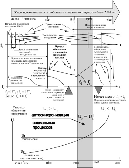 Выявленные частоты fс и fб — это меры скорости обновления информационного состояния общества (как иерархически организованной системы) на социальном и биологическом уровнях в его организации. На графике (приблизительно) неизменная Uг характеризует скорость обновления генетической (индекс «г») информации в популяции; возрастающая на протяжении всей истории Uс характеризует скорость обновления культуры, как информации не передаваемой генетически от поколения к поколению.
