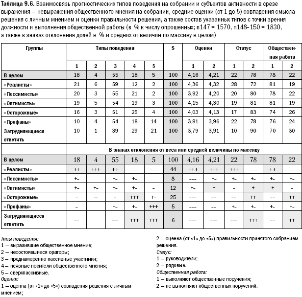 Итак, наиболее представительные группы по прогнозам – «реалисты» и «осторожные» – составляют в сумме 69 % ответивших на вопросы. Среди прогнозистов-«реалистов» наиболее резко (с 95 % вероятностью) увеличивают долю преднамеренно пассивные (имели мнение, но выступать не собирались) и в среднем (с 90 % вероятностью), как выступившие, так и несостоявшиеся ораторы. Среди «осторожных» в прогнозе резко увеличивается доля «неявных носителей мнения», среди «профанов» – доля «сверхпассивных», а среди затрудняющихся дать прогноз в той же степени растут доли и тех и других. Реалисты дают наиболее высокие и резко отклоняющиеся от средних по массиву участников в целом средние оценки и совпадения решения с личным мнением, и правильности принятого решения. В их группе увеличивается вес руководства предприятием или учреждением и общественных активистов. Среди «осторожных», «профанов» и затрудняющихся ответить резко падает вес выступающих, снижается средняя оценка совпадения решений с личным мнением и правильности решений, уменьшается удельный вес руководителей и имеющих общественную работу.