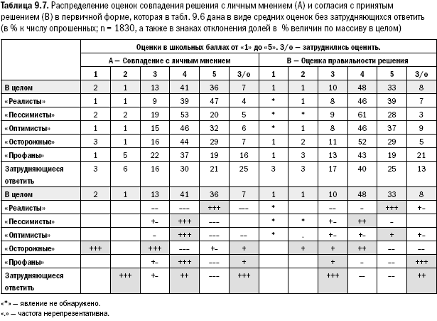 Группы по прогнозу – это группы степени совпадения представлений людей с реальностью. Степени эти весьма разные. Люди дифференцированы по проекции своих представлений на предстоящую развертку событий. Но абсолютно все группы – от «пессимистов» до «профанов» и затрудняющихся ответить (исключая «реалистов») – дают в рост средние оценки правильности принятого коллективом решения от средних оценок соответствия этого решения личному мнению. Наибольший рост у «пессимистов» (то-то радость освободиться от «мрачных» предчувствий!). Только «реалисты» в сотых долях средней снижают оценку правильности решения относительно соответствия решения личному мнению. Таким образом, исследование до и после обсуждения говорит о сдвиге оценок к коллективно выработанной норме. Совпадение с личным мнением может быть низким и у «пессимистов», и у предельно неинформированных, но степень согласия с правильностью принятого решения растет у всех. Это подтверждается не только на средних, но и в простом распределении оценок по баллам.