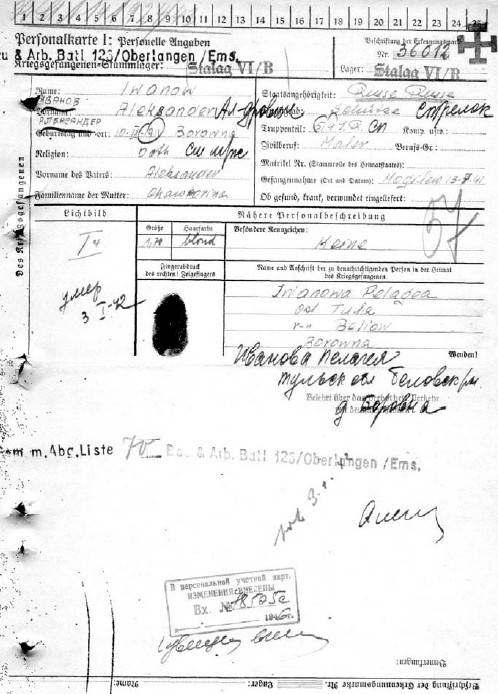Карточка военнопленного Иванова Александра – отца Иванова И.А.