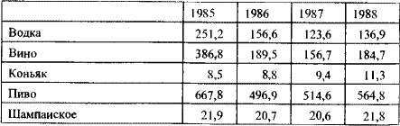 Кампания борьбы с алкоголизмом предполагала ежегодное сокращение производства и реализации водки и ликероводочных изделий на 10%, уменьшение их выпуска за пять лет наполовину. Выпуск плодово-ягодных алкогольных напитков в 1988 г. должен был прекратиться. Уже в 1985–1986 гг. производство алкогольных напитков сократилось более чем в два раза. В начале антиалкогольной кампании советское руководство надеялось, что повышение цен на алкоголь позволит компенсировать примерно 80% потерь бюджета и товарооборота от уменьшения объемов продажи алкогольных напитков в натуре.[347] Развитие событий показало, что это было иллюзией.