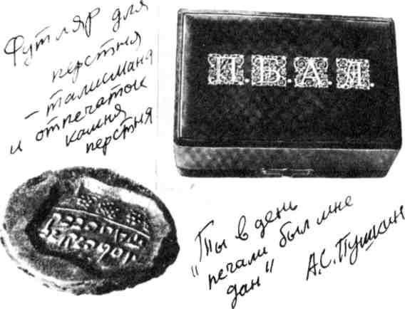 «Сестра Пушкина рассказывала, что, когда приходило ему письмо с такой же печатью, как на его перстне, он запирался в своей комнате, никуда не выходил, никого не принимал».