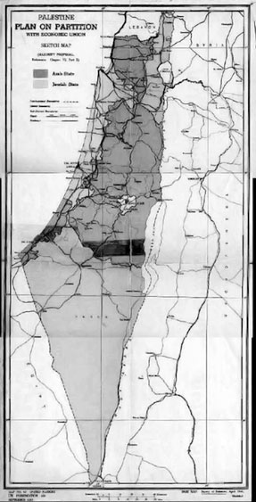 Ил. 54. План раздела территорий между еврейским и арабским государствами («Приложение А» к резолюции ООН № 181). В «Приложении B» показаны примерные разделительные границы в районе Иерусалима. Можно было бы ожидать, что в «Приложении С» будет продемонстриро ван раздел территорий в районе Яффы и Тель-Авива, однако единственное упоминание о нем содержится лишь в самом тексте, в части, посвященной арабскому государству: «Терри тория арабского “анклава” состоит из той части распланированного участка Яффы, который находится к западу от еврейских кварталов, лежащих к югу от Тель-Авива, к западу от продолжения улицы Герцля до пересечения ее с дорогой из Яффы в Иерусалим [в настоящее время дорогой Кибуц-Галуйот. – Ш. Р.], к юго-западу от той части этой дороги, которая находится к юго-востоку от этого пересечения, к западу от земель Микве-Исраэль, в северо-западном углу земель местного совета Холона, в северо-восточном углу района местного совета Бат-Ям. Вопрос о квартале Картон должен быть разрешен разграничительной комиссией, учитывая, наряду с другими соображениями, желательность включения возможно наименьшего числа арабов и возможно наибольшего числа евреев в состав населения еврейского государства».