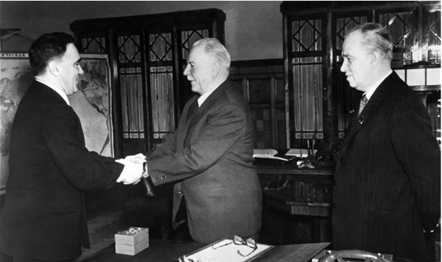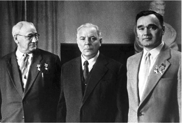 А.Н. Туполев, К.Е. Ворошилов и А.С. Яковлев после церемонии вручения второй золотой медали «Серп и молот» Героя Социалистического Труда по указу от 12.07.57 г. Август 1957 г. Архив ОАО «ОКБ им. А.С. Яковлева».