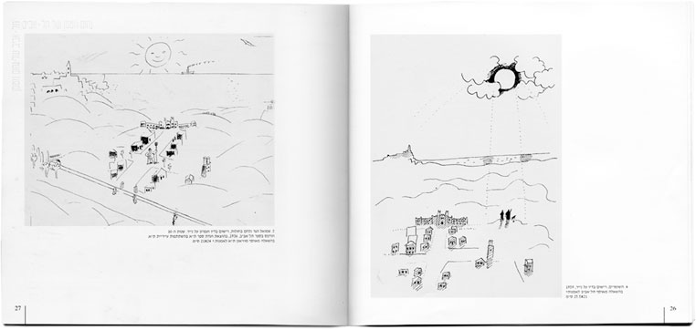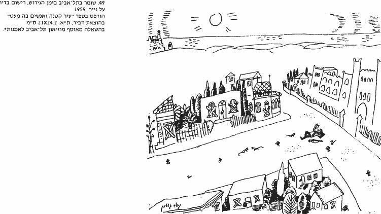 Повторяя один и тот же образ на протяжении всей жизни, Гутман изображал «маленький Тель-Авив» своего детства, времен Первой мировой войны – с опустевшими кварталами, откуда еврейское население было изгнано османскими властями. На его рисунках город одиноко парит над бесконечными голыми дюнами. В этой исправленной панораме ничто не отделяет Тель-Авив от моря – ни арабский квартал Маншия, ни еврейско-йеменский Керем ха-Тейманим. Гутман часто меняет направление улицы Герцля и разворачивает весь город на запад, к морю – так, что сразу за гимназией «Герцлия» начинается пляж. На его рисунках «маленький Тель-Авив» изображен в разных ракурсах, но кроме смутно угадываемого силуэта церкви Святого Петра, притулившейся на вершине Яффского холма, за белыми дюнами, еврейский город стоит в полном одиночестве[118].