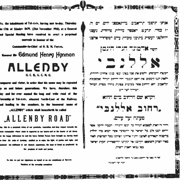 Ил. 40. Посвящение улицы Алленби: «Мы, жители Тель-Авива, собрались сегодня, во вторник, 17 кислева 5679 (21 ноября 1918 года), на общее и особое собрание, чтобы увековечить память главнокомандующего экспедиционным корпусом генерала Эдмунда Генри Хинмена Алленби, победителя, в надежде, что его имя останется в памяти нашего и следующих поколений. Мы присвоили славное имя Алленби длинной и широкой дороге города Тель-Авива, расположенной к северо-востоку от железнодорожных путей и ведущей к морю, так что теперь она называется “улица Алленби”. Таким образом мы от лица всех евреев выражаем сердечную благодарность и глубокое уважение к командующему. Отважные британские войска принесли нам избавление, освободив от ига тирании, во имя торжества справедливости. Они приблизили час исполнения нашей исторической миссии, надежды Израиля, как это предсказывали пророки, провозвестники истины и справедливости».