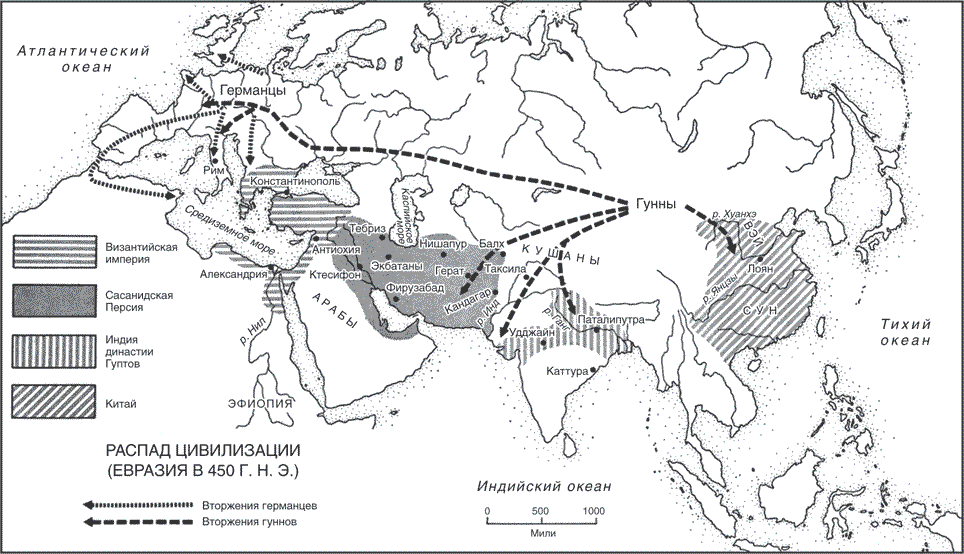 На остальной части Евразии период с 200 до 450 года стал временем зарождения заметных изменений следующего тысячелетия. Одним из объединяющих факторов эпохи стали брожения среди кочевников на севере. Гунны и подобные им народы обрушивались на слабые в политическом отношении богатые земли. Наши скудные исторические источники подтверждают их неоднократные разрушительные набеги на Китай, Индию и сасанидскую Персию. В отличие от монголов при Чингисхане у кочевников-завоевателей с IV по VI век не было гениального лидера. Хотя в V веке они создали одно государство на большей части Европы, а второе – в Центральной Азии, оба просуществовали недолго. Подобно урагану кочевники налетали, разрушали все на своем пути, а затем исчезали в никуда.