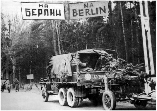 «На Берлин!» Грузовик «Студебеккер» с орудием на буксире из состава 1-й армии Войска Польского. Апрель 1945 г.