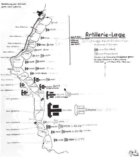 Копия графического отображения данных разведки группы армий «Висла» о сосредоточении советской артиллерии. Самый большой «молот» – напротив Зееловских высот