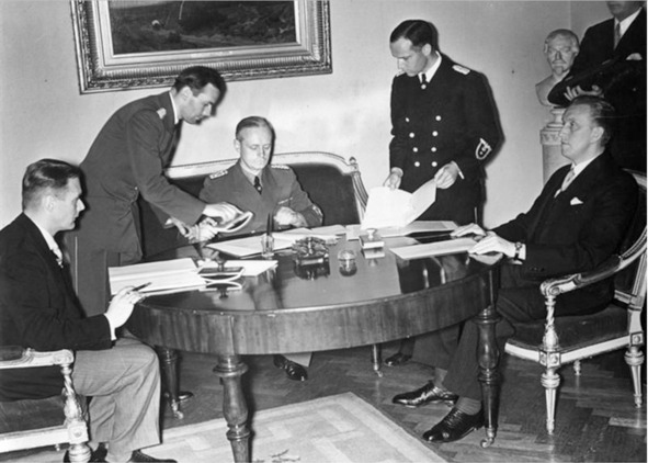 Подписание германо-эстонского и германо-латвийского договоров о ненападении. На фотографии за столом, слева направо: В. Мунтерс, И. фон Риббентроп, К. Сельтер.