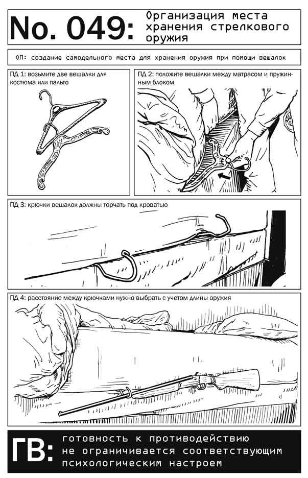 Стандартные советы, которые дают на этот случай гражданские лица, сводятся в основном к двум вариантам: класть ружье под кровать или матрас или ставить его у изголовья. Однако это не выход: с одной стороны, оружие оказывается слишком близко от голов спящих членов семьи, а с другой — такое размещение вовсе не обеспечивает быстрого доступа к нему. К счастью, можно предложить очень быстрое в реализации и при этом удивительно надежное решение. Держатель для оружия можно сделать из двух обычных вешалок, которые кладутся под матрас так, чтобы их крючки выступали наружу. В этом случае вы легко достанете свой автоматический карабин, охотничье ружье или дробовик. (Последний при выборе оружия для обеспечения безопасности дома — предпочтительный вариант. В отличие от пуль, крупная дробь не пробивает гипсокартон насквозь, но ее вполне достаточно для обезвреживания злоумышленника, незаконно проникшего в дом. Так как при каждом выстреле из дробовика в сторону цели летит множество свинцовых дробинок, площадь поражения больше, чем от пули, и поэтому требуется меньшая точность.)